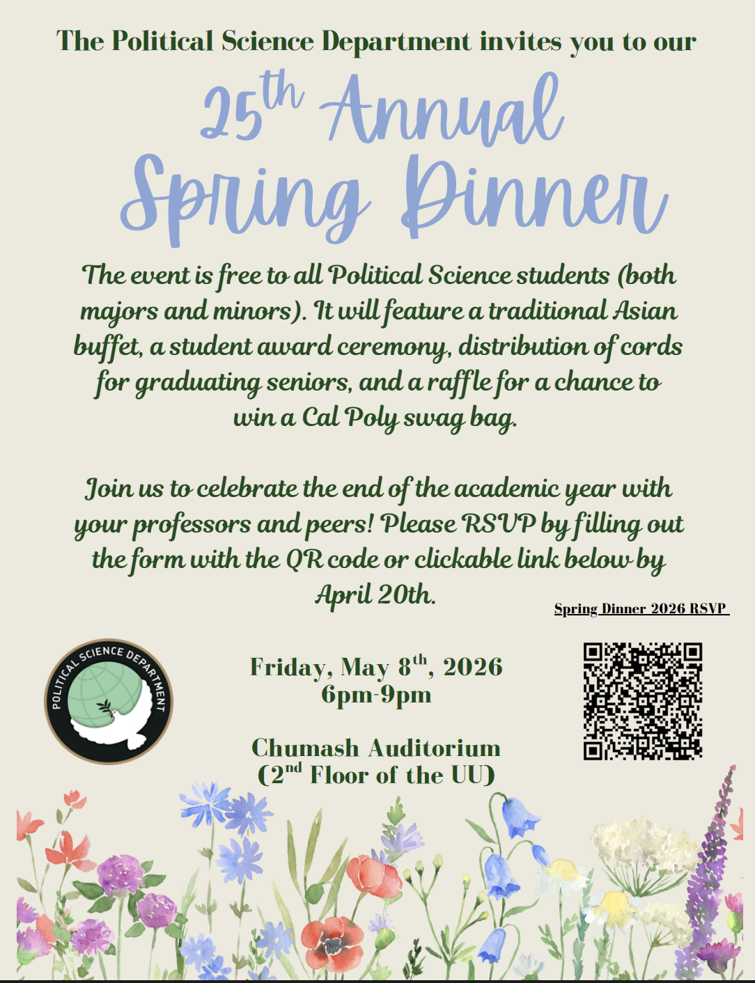The POLS Department is hosting its annual Spring Dinner on Friday, May 8th in the Chumash Auditoriam (2nd Floor of the UU).